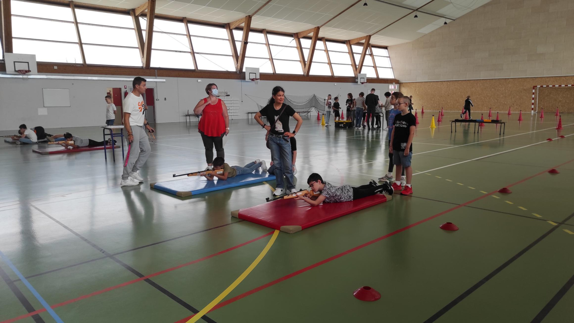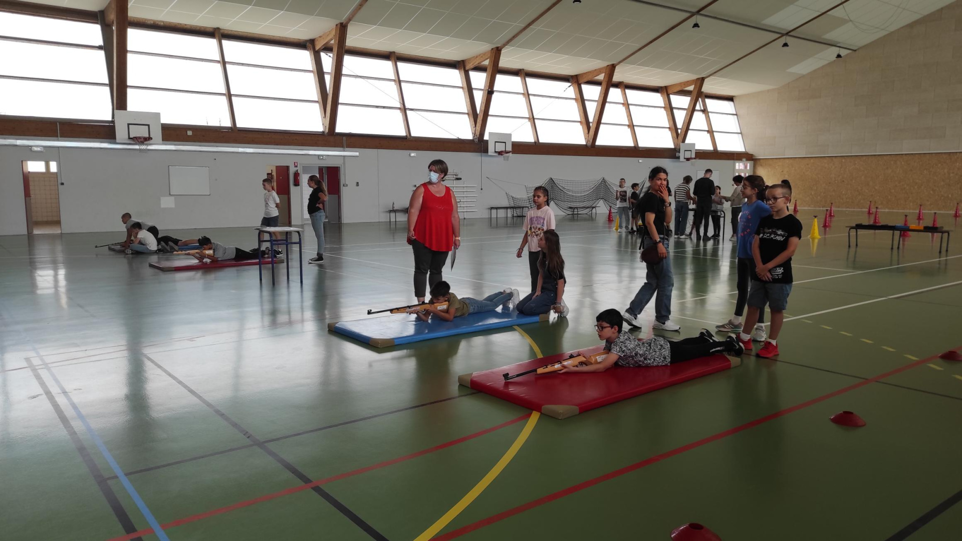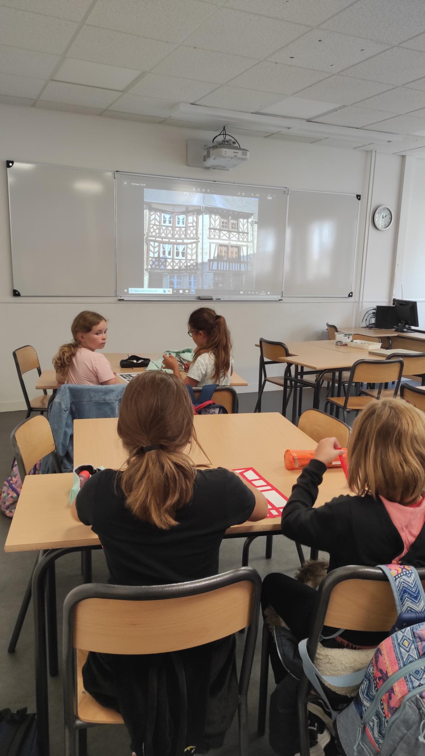 Au cours de l’après midi, les classes participent à des ateliers de cohésion : on crée son « gang », son cri de guerre, on participe à des jeux collaboratifs, on étudie les colombages de la cité médiévale (sur photo, alerte pluie oblige…), et on s’implique dans les activités sportives.