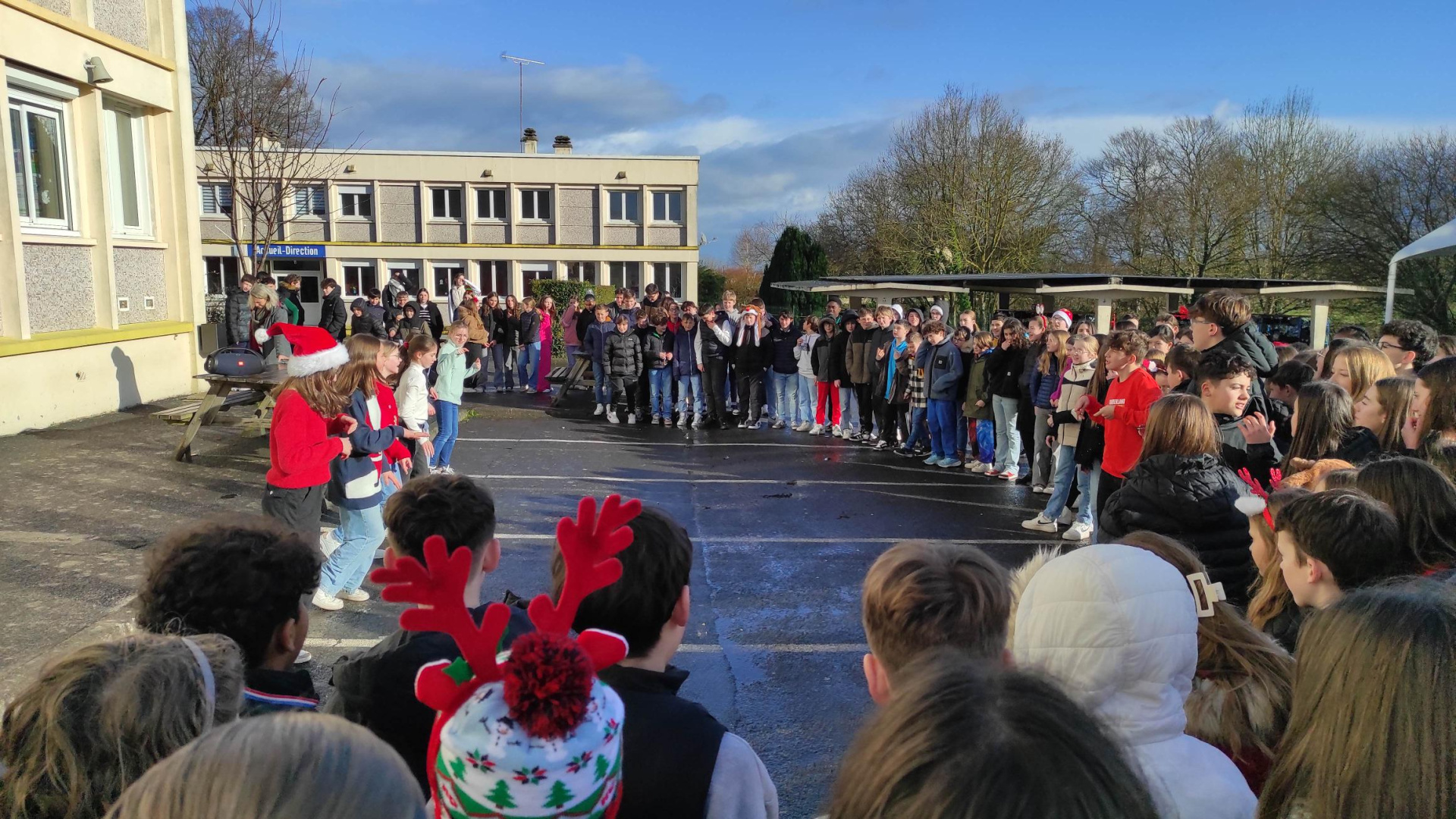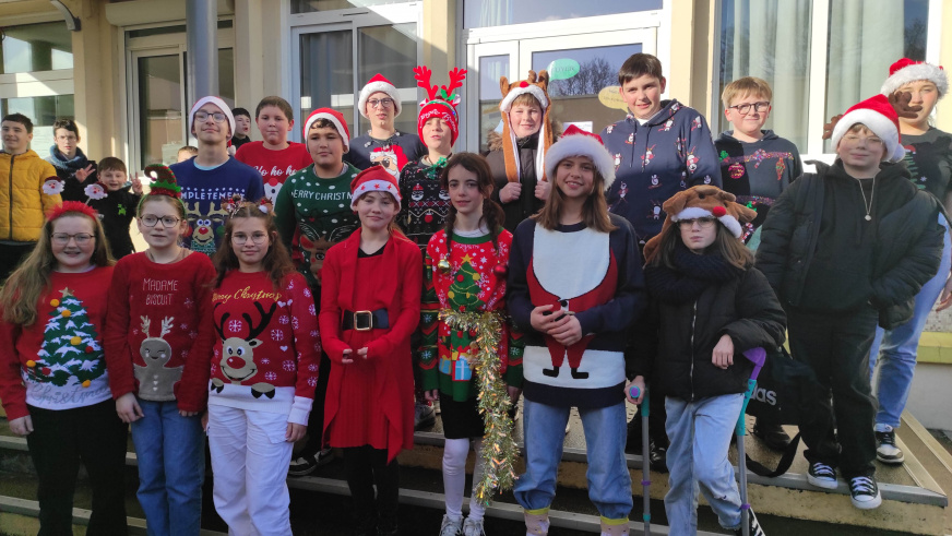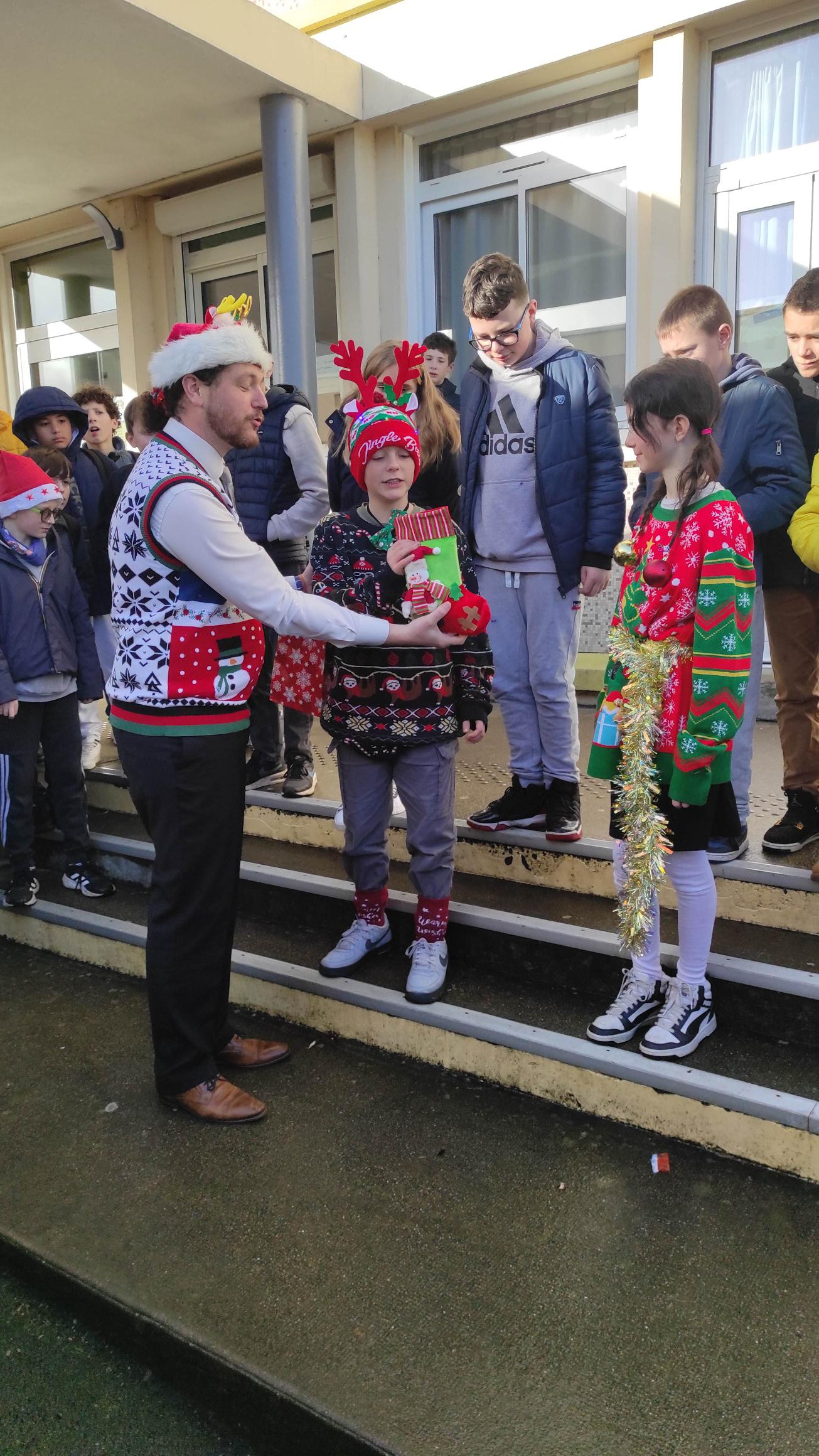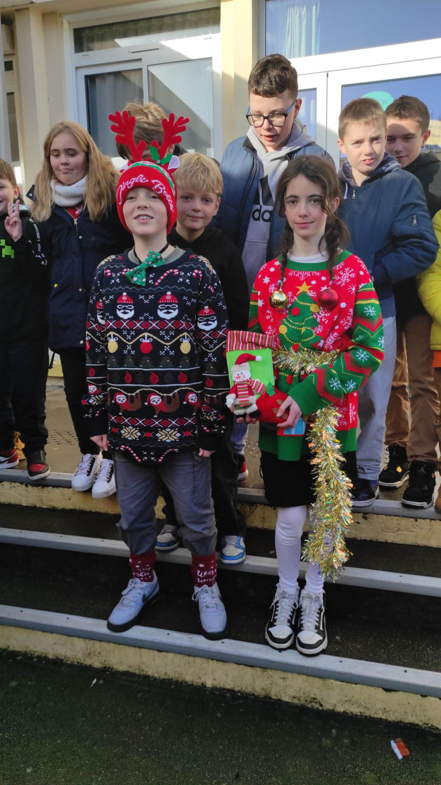 Dès 8h15 au portail ce matin du jeudi 19 décembre, les bonnets rouge et blanc, les serre-têtes « bois de rennes », les pulls et tenues diverses et variées ont envahi la cour de récréation.