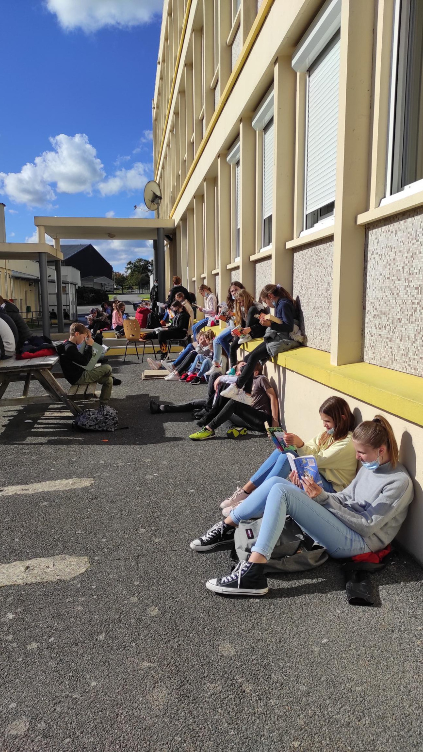 Sous un soleil radieux, après la pause déjeuner, dans la cour de récréation bien animée, tout le monde s’agite… Les uns filent vers leur casier, les autres vers leur cartable, pour y dénicher un livre, un magazine. Certains errent, perdus : « Je n’ai pas de livre, je l’ai oublié… » « Pas grave, regarde, dans le bac, sur la cour, on en a emmené quelques uns : choisis celui qui te plaît et installe toi ! »